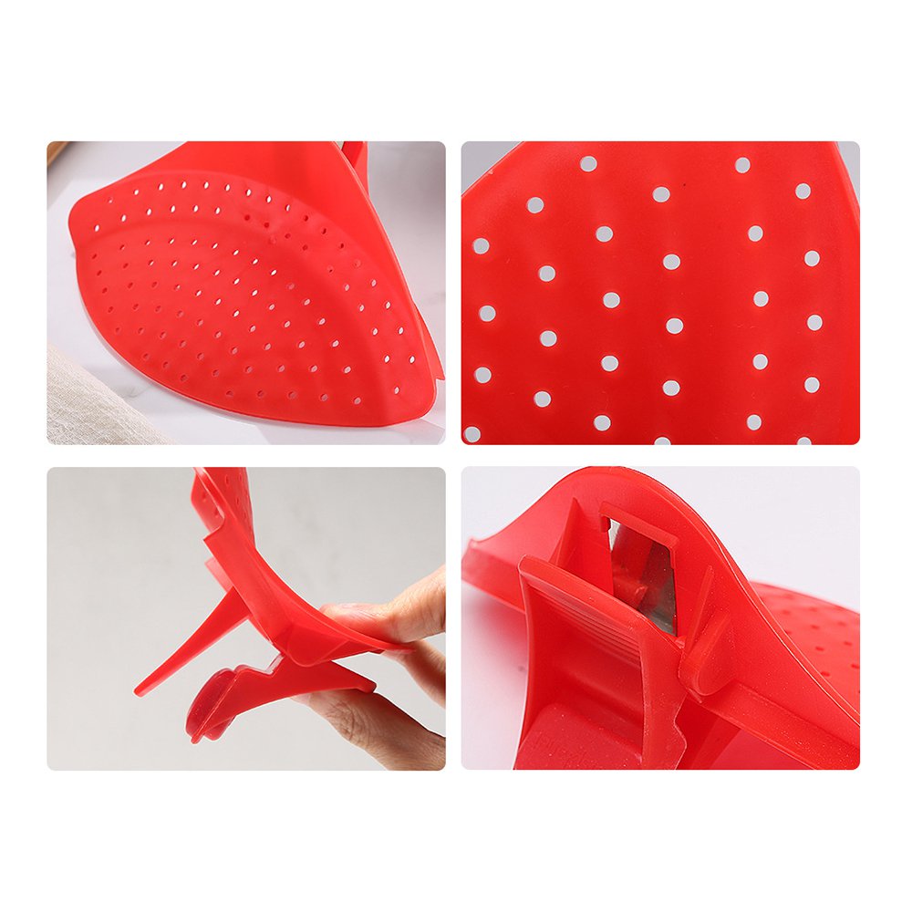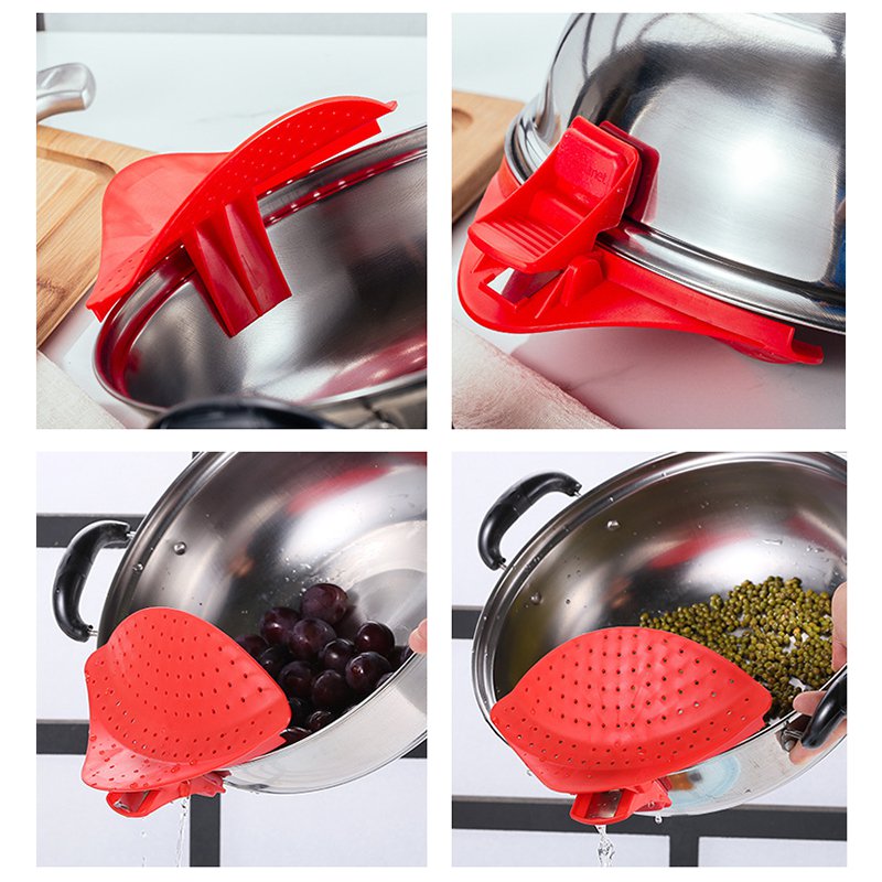 - Stainless steel reinforced clip with silicone gripper firmly attaches to the side of cookware to make straining liquids a breeze